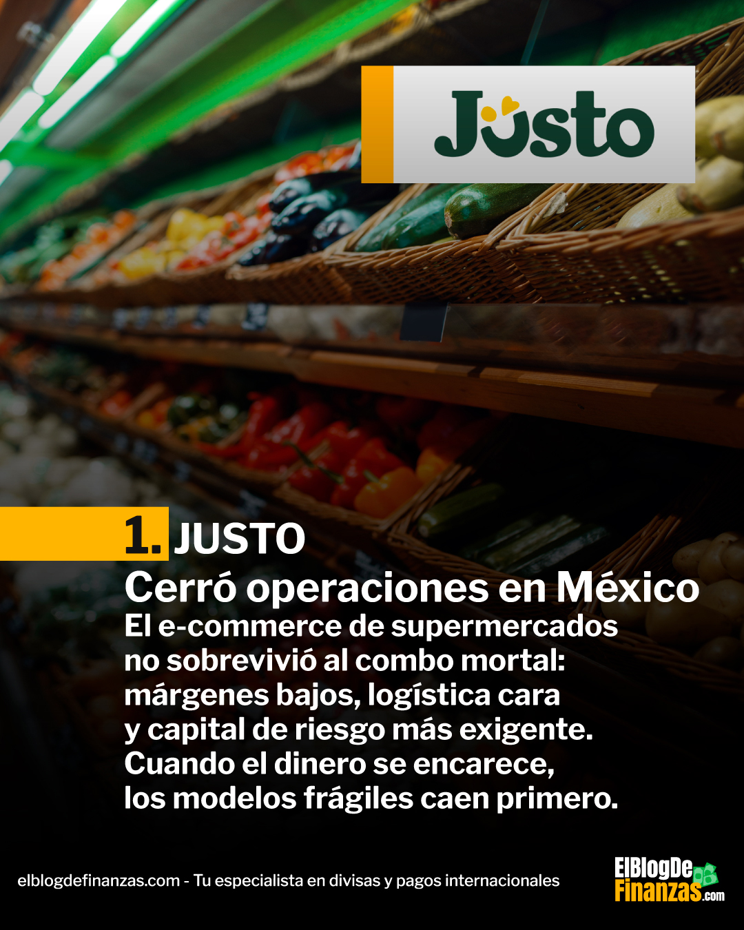 Justo anunció el cierre total de operaciones en México tras varios meses de ajustes, despidos y búsqueda de capital. El modelo de grocery digital enfrentó márgenes muy estrechos, altos costos logísticos y un entorno financiero más restrictivo para startups en Latinoamérica.